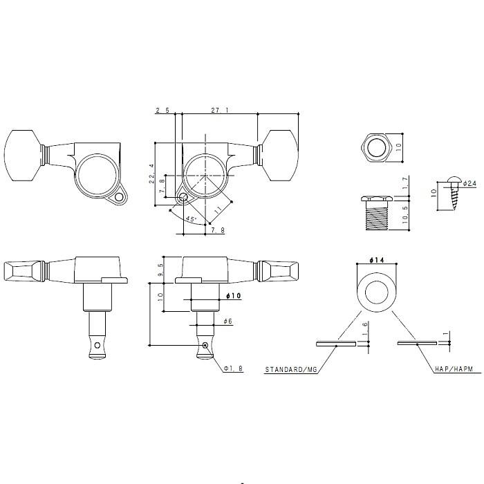 ギア比:1:15 カラー:クローム、ブラック、ゴールド ペグボタン:標準、kidney、チューリップ(キーストーン) ※L6配列でもキーストーン型(チューリップ)が選択できますが、おそらくボタンが大きすぎて搭載不可能です。
