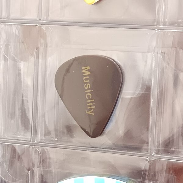 Musiclilyのおまけピックや、PLAYTECHの弦に付属するおまけピックなどを、中央に堂々と配置するとユニークな演出になります。寄せ書きメッセージ用のピックを誤って使われないよう、収納ポケットのフタをセロテープなどで軽く封しておくと安心です。